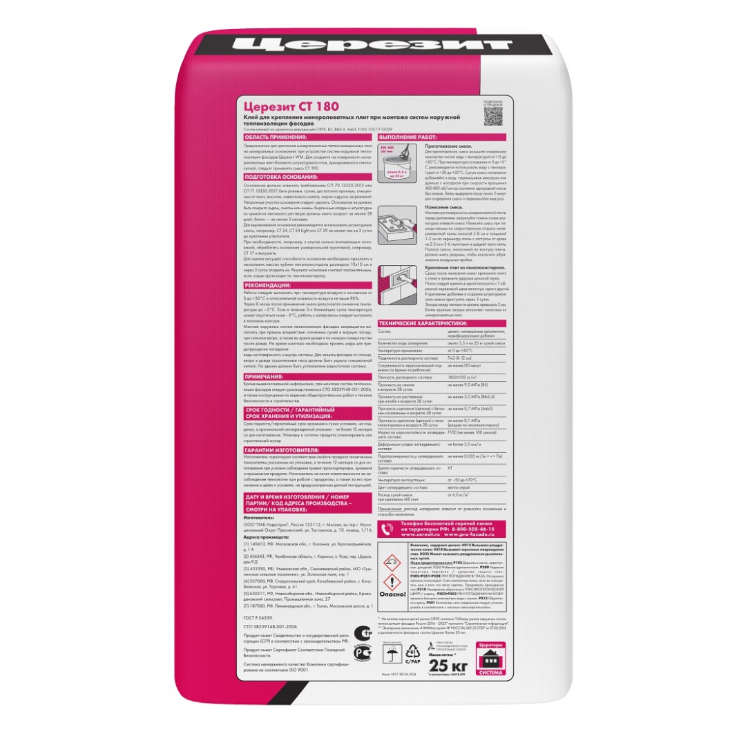 Клеящий состав марки CT 180 разработан для монтажа теплоизоляционных плит из минеральной ваты на основания минерального происхождения. Незаменим в устройстве наружной фасадной теплоизоляции системы Ceresit WM.