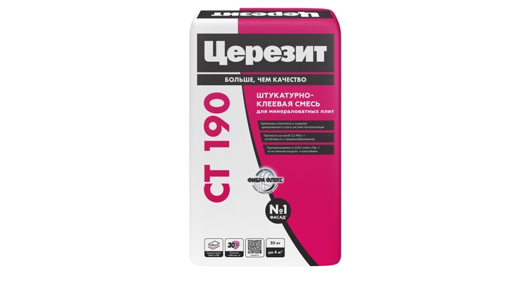 Смесь CT 190 – один из лучших штукатурно-клеевых составов для устройства надежной фасадной теплоизоляции системы Ceresit WM. Продукт предназначен для наружных работ. Он обеспечивает прочную сцепку минераловатных плит с минеральными основаниями. Клей позволяет создавать на поверхностях базовый штукатурный слой с армированной стеклосеткой.