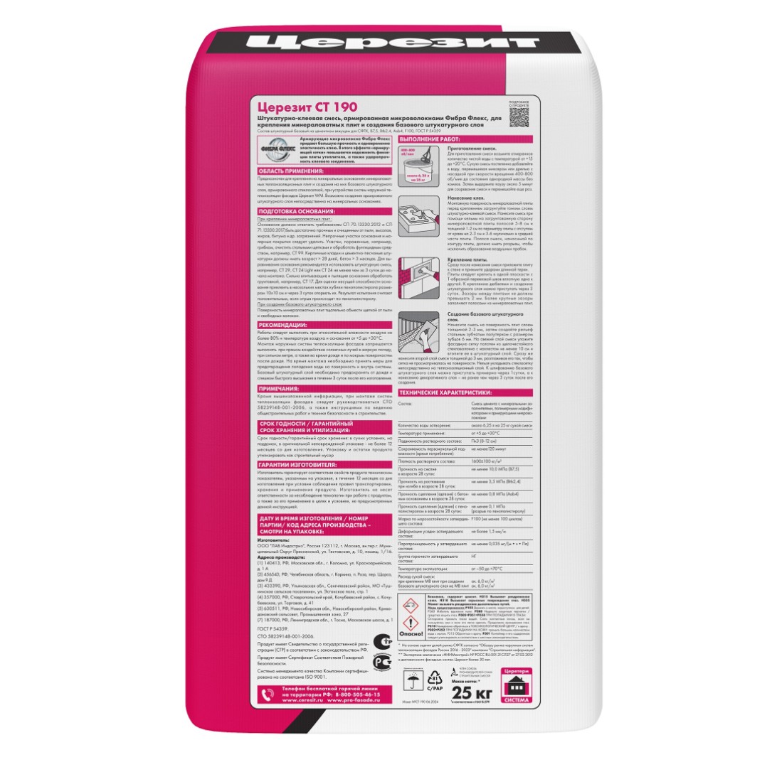 Описание товара: "Штукатурно-клеевая смесь Ceresit СТ 190 для МВ плит (25 кг)"