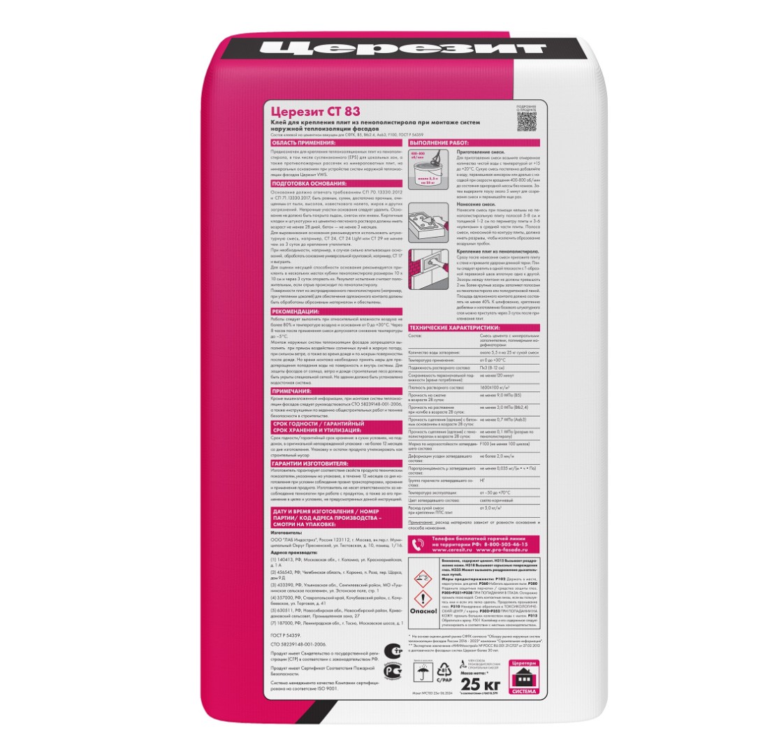 Описание товара: "Клей Ceresit СТ 83 для пенополистирола (25 кг)"