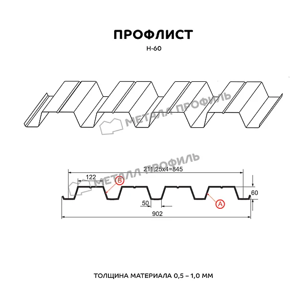Профлист МЕТАЛЛ ПРОФИЛЬ Н-60x845-A (ПЭ-01-7004-0,7) широко применяется для обустройства профилированного листа. Изначально он представляет собой лист оцинкованной стали с покрытием. Общая толщина металла с оцинковкой и полимерным слоем — 0.7 мм. После проката на специальном оборудовании сталь приобретает рисунок из повторяющихся волн. Такая форма придает профилю несущую способность.