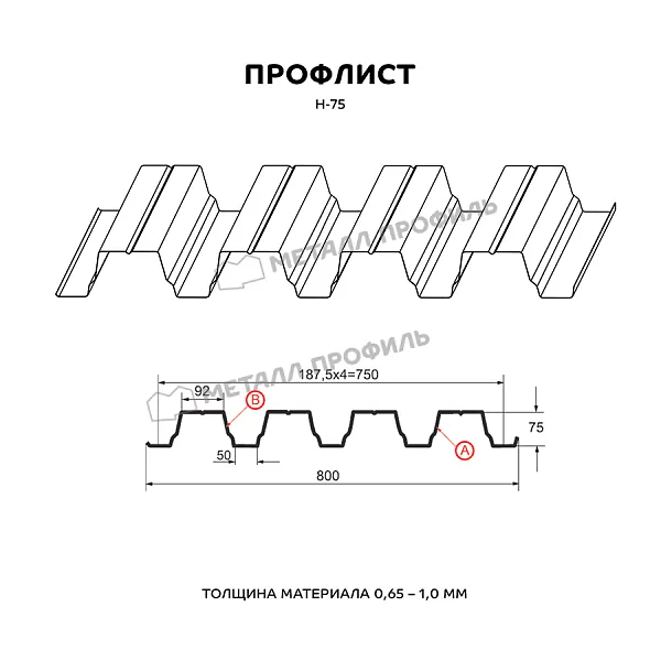Профлист МЕТАЛЛ ПРОФИЛЬ Н-75x750-A (ПЭ-01-3005-0,65) часто используется для монтажа профилированного листа. Изначально он представляет собой лист оцинкованной стали с покрытием. Толщина стальной основы с оцинковкой и декоративно-защитным покрытием — 0.65 мм. После проката на специальном оборудовании металл принимает волнообразный вид. Такая форма придает профилю несущую способность.